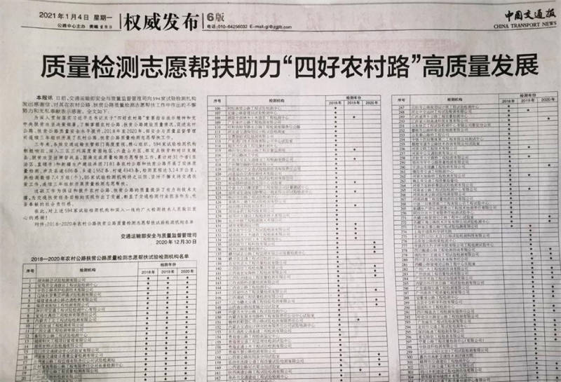 2020年12月30日,佳岳公司收到來自交通運(yùn)輸部安全與質(zhì)量監(jiān)督管理司的感謝信,并在1月4日中國(guó)交通報(bào)6版以《質(zhì)量檢測(cè)志愿幫扶助力“四好農(nóng)村路”高質(zhì)量發(fā)展》為題進(jìn)行了專題報(bào)道,對(duì)交建集團(tuán)佳岳檢測(cè)公司在農(nóng)村公路、扶貧公路質(zhì)量檢測(cè)志愿幫扶工作中作出的不懈努力和無私奉獻(xiàn)表示感謝。