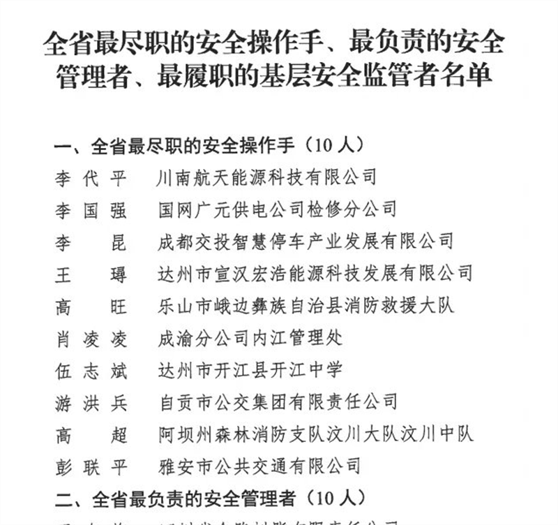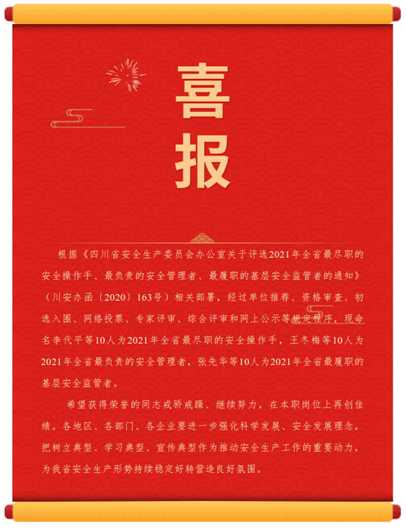 此次評選活動,最終命名“全省最盡職的安全操作手、最負(fù)責(zé)的安全管理者、最履職的基層安全監(jiān)管者”各10名。彭聯(lián)平通過單位自薦、資格審查、初選入圍、網(wǎng)絡(luò)投票、專家評審、綜合評審和網(wǎng)上公示層層選拔,最終獲得“2021年全省最盡職的安全操作手”稱號,是雅安市唯一獲此殊榮的個人。