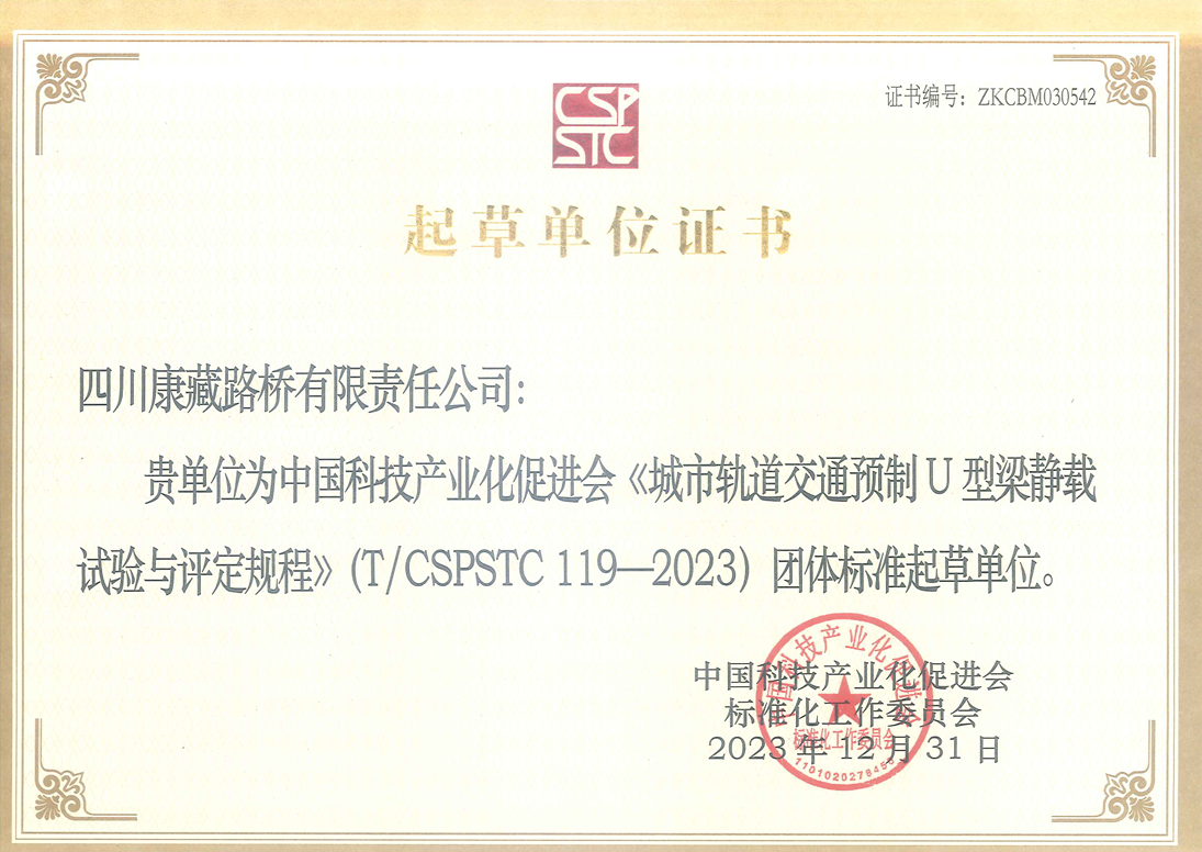 日前,雅安市交通建設(集團)有限責任公司收到中國科技產業(yè)化促進會頒發(fā)的《城市軌道交通預制U型梁靜載試驗與評定規(guī)程》(T/CSPSTC119-2023)團體標準起草單位證書,路橋公司參與起草的《城市軌道交通預制U型梁靜載試驗與評定規(guī)程》團體標準,于2023年12月31日正式發(fā)布實施。