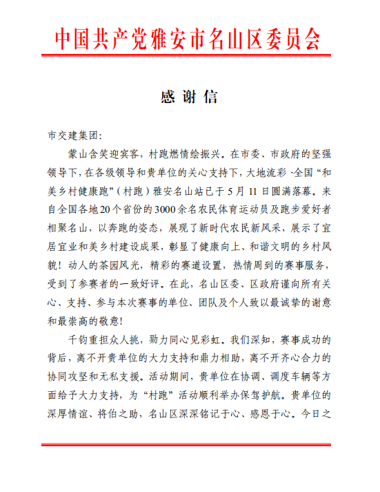 5月10日至11日,以“心向和美 逐夢(mèng)茶源”為主題的大地流彩·2025年全國(guó)和美鄉(xiāng)村健康跑(村跑)雅安名山站活動(dòng)在雅安市名山區(qū)成功舉辦。四川蜀通運(yùn)業(yè)有限責(zé)任公司作為運(yùn)輸保障單位,圓滿完成賽事期間各項(xiàng)運(yùn)輸保障任務(wù),為活動(dòng)的順利開(kāi)展提供了堅(jiān)實(shí)保障,受到名山區(qū)委、區(qū)政府感謝信。