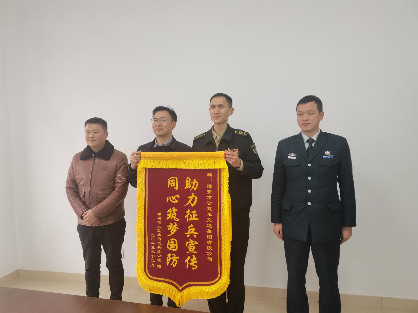 近日,雅安市人民政府征兵辦公室副主任、雅安軍分區(qū)動(dòng)員處上校處長賈子龍一行專程赴公交集團(tuán)贈(zèng)送錦旗,感謝公交集團(tuán)在2025年度征兵公益宣傳工作中作出的貢獻(xiàn),公司董事長李強(qiáng)軍接待并開展座談。