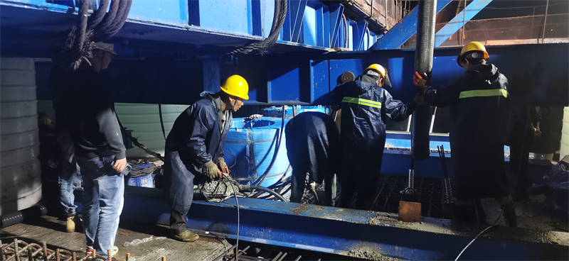 由于中跨合攏段施工要求高,我司于9月10日就開始右幅中跨合攏段鋼筋制作工作。工地現(xiàn)場實測最高溫47攝氏度,而混凝土須低于30攝氏度澆筑才能確保質量。為此,項目部將一線施工作業(yè)時間進行了調整,避開了10:00至16:30的高溫時段,選在溫度偏低的夜間進行施工。項目部人員全力以赴與時間賽跑,與天氣斗爭,于9月17日23點開始進行混凝土澆筑,經過徹夜奮戰(zhàn)于凌晨2點30分完成合攏段全部施工,有效保證了合攏段施工質量。