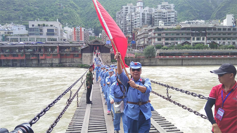 活動中,全體黨員干部職工換上紅軍服、戴上紅軍帽,走上瀘定橋,觸摸著沾染了無數(shù)革命烈士鮮血的鐵索,瞬間將大家的思緒拉回到1935年的529日,22名勇士冒著敵人的槍林彈雨,攀著鐵鏈沖向?qū)Π,英勇奪下瀘定橋,取得長征中的一次決定性勝利場景。大家無不被革命先輩的英勇與無畏所震撼。