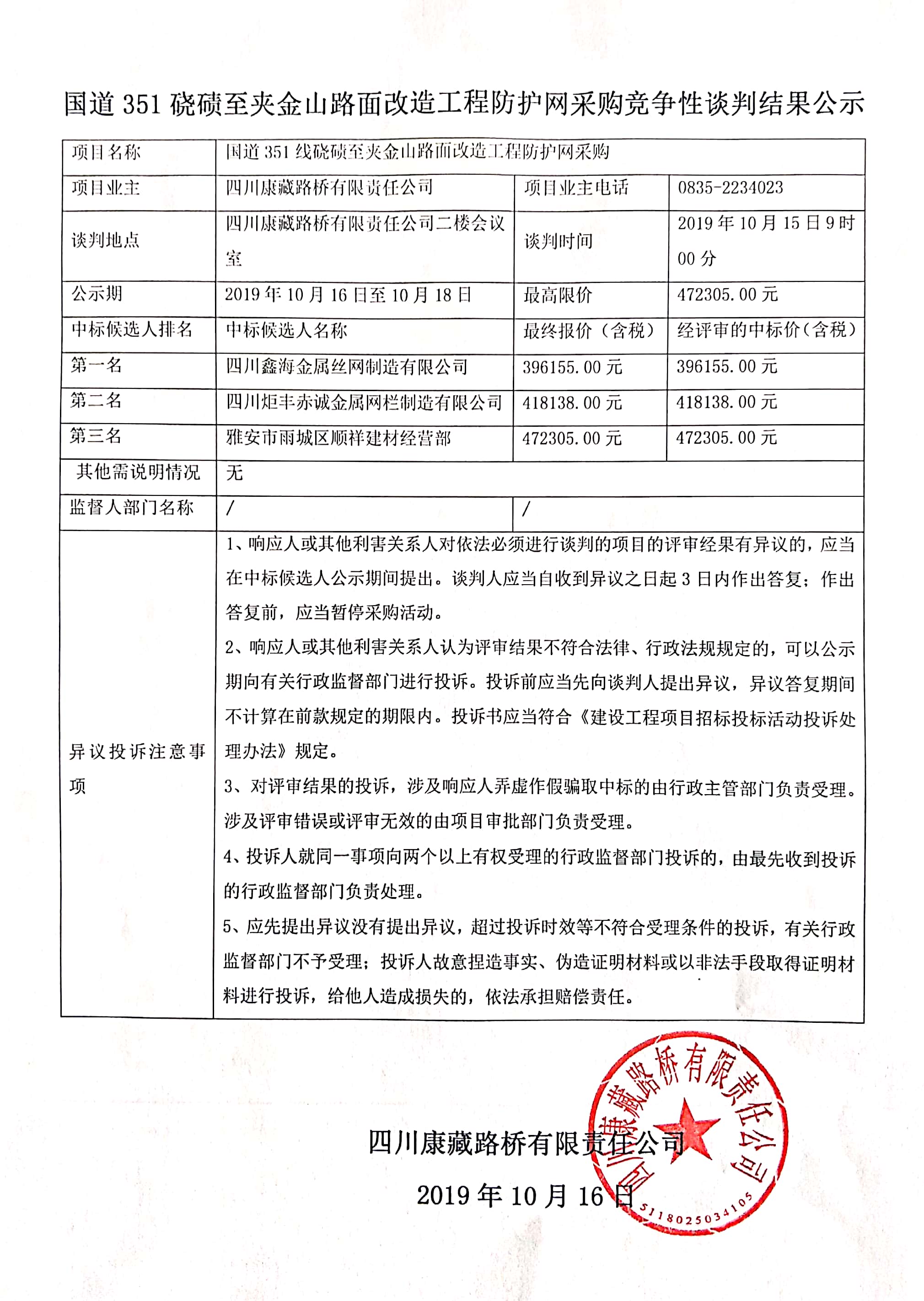四川康藏路橋有限責(zé)任公司國(guó)道351磽磧至夾金山路面改造工程防護(hù)網(wǎng)采購(gòu)競(jìng)爭(zhēng)性談判結(jié)果公示