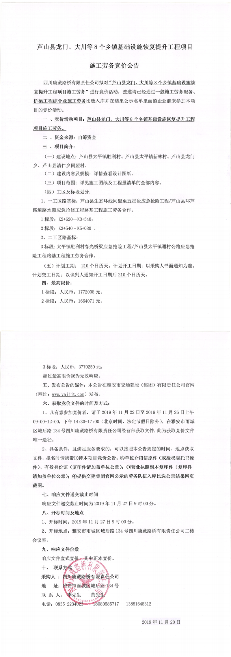 四川康藏路橋有限責任公司蘆山縣龍門、大川等8個鄉(xiāng)鎮(zhèn)基礎(chǔ)設(shè)施恢復(fù)提升工程項目施工勞務(wù)競價公告