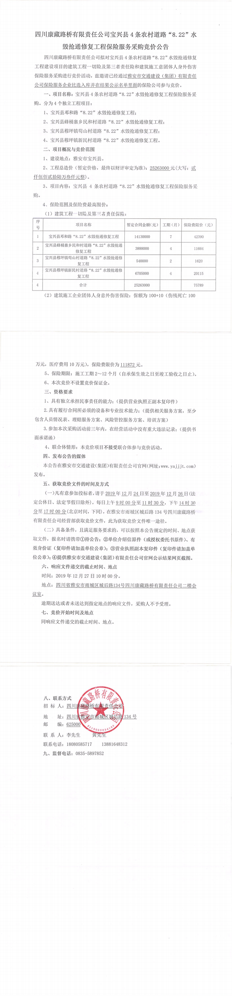 四川康藏路橋有限責(zé)任公司寶興縣4條農(nóng)村道路“8.22”水毀搶通修復(fù)工程保險服務(wù)采購競價公告