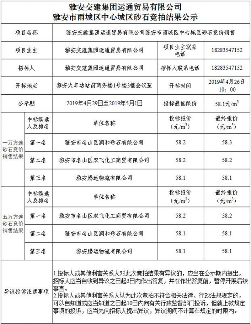 雅安交建集團(tuán)運(yùn)通貿(mào)易有限公司雨城區(qū)中心城區(qū)砂石競(jìng)拍結(jié)果公示