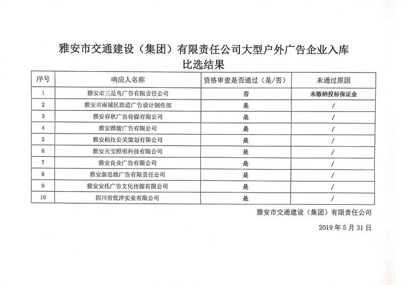 雅安市交通建設(shè)(集團(tuán))有限責(zé)任公司大型戶外廣告企業(yè)入庫(kù)比選結(jié)果