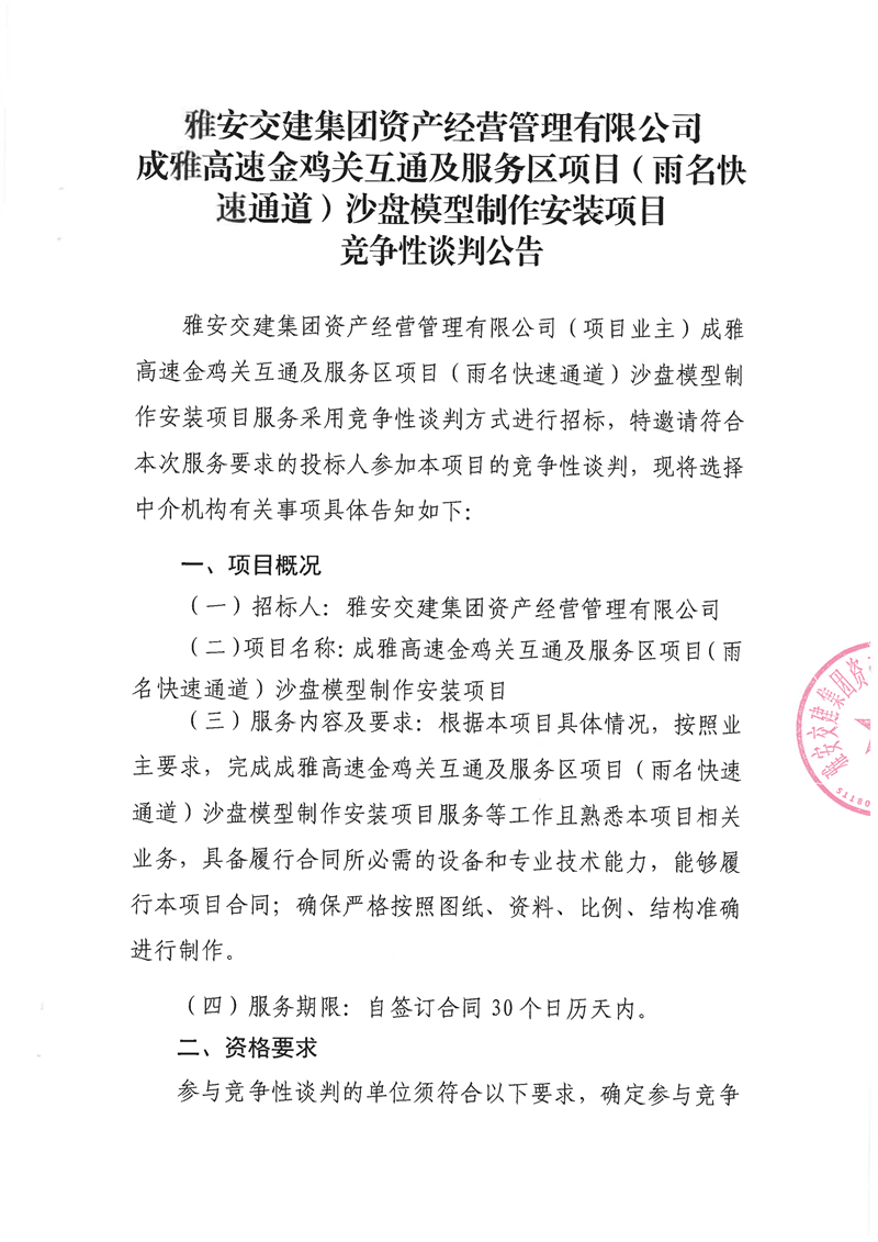 雅安交建集團(tuán)資產(chǎn)經(jīng)營(yíng)管理有限公司成雅高速金雞關(guān)互通及服務(wù)區(qū)項(xiàng)目(雨名快速通道)沙盤模型制作安裝項(xiàng)目競(jìng)爭(zhēng)性談判公告