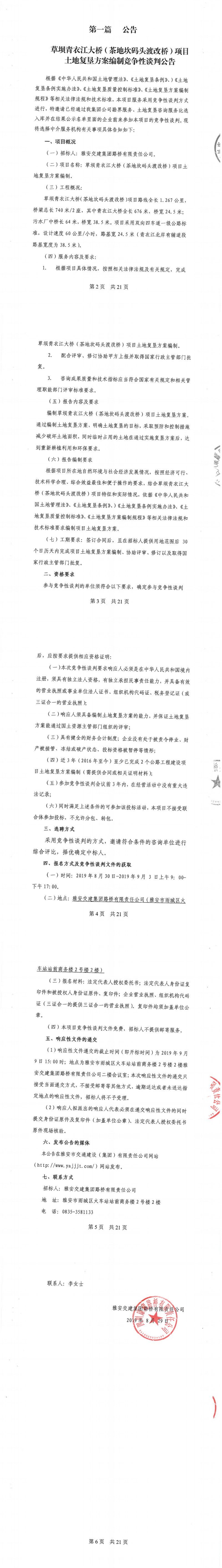 雅安交建集團路橋有限責任公司草壩青衣江大橋(茶地坎碼頭渡改橋)土地復墾方案編制競爭性談判公告