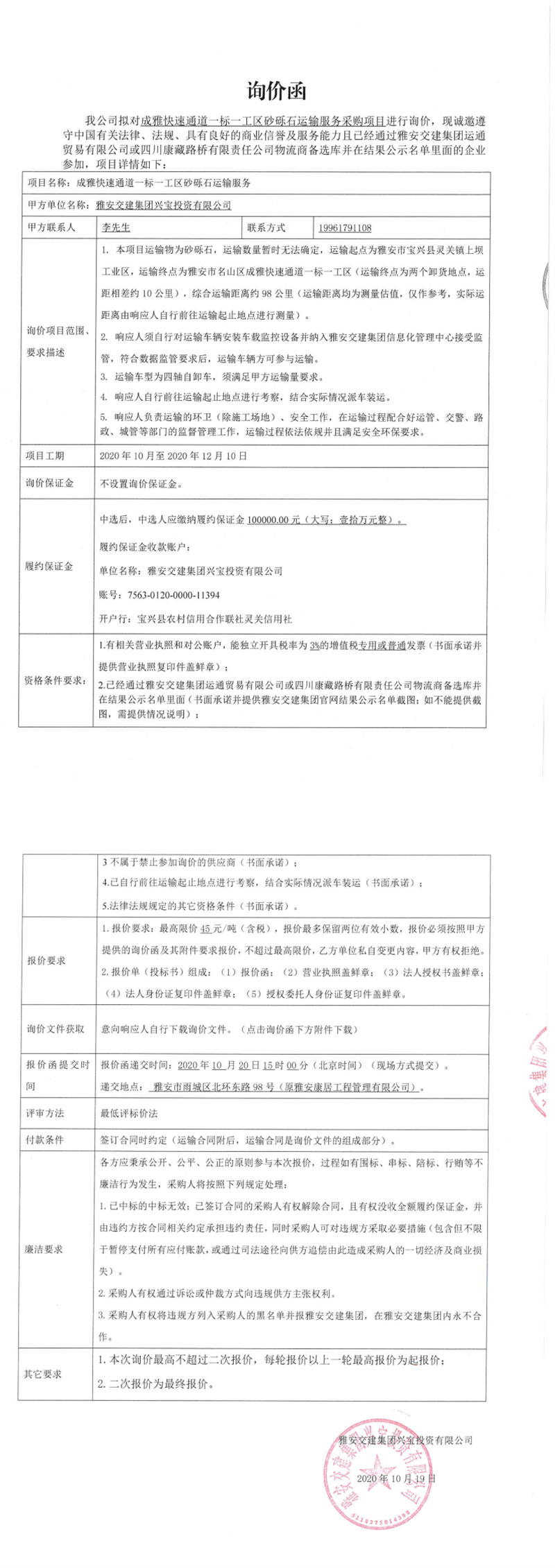雅安交建集團(tuán)興寶投資有限公司成雅快速通道一標(biāo)一工區(qū)砂礫石運(yùn)輸服務(wù)采購項(xiàng)目詢價(jià)函