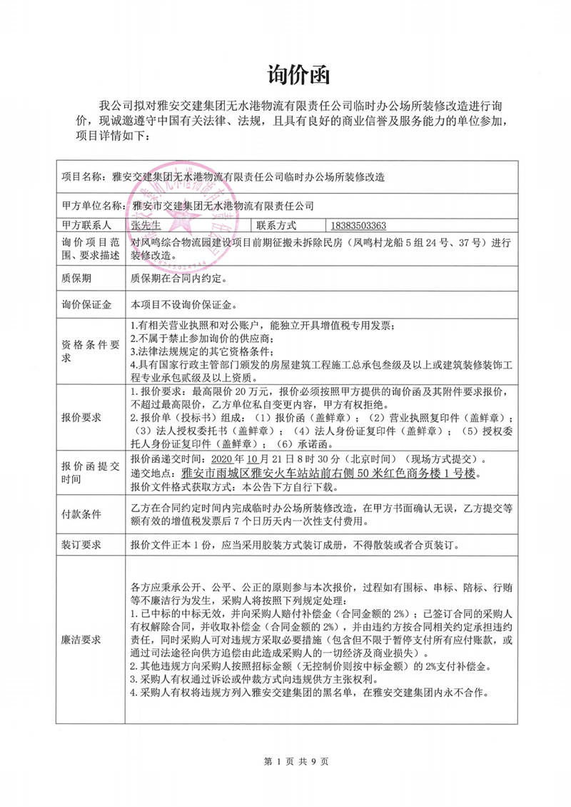 雅安交建集團無水港物流有限責任公司臨時辦公場所裝修改造詢價函