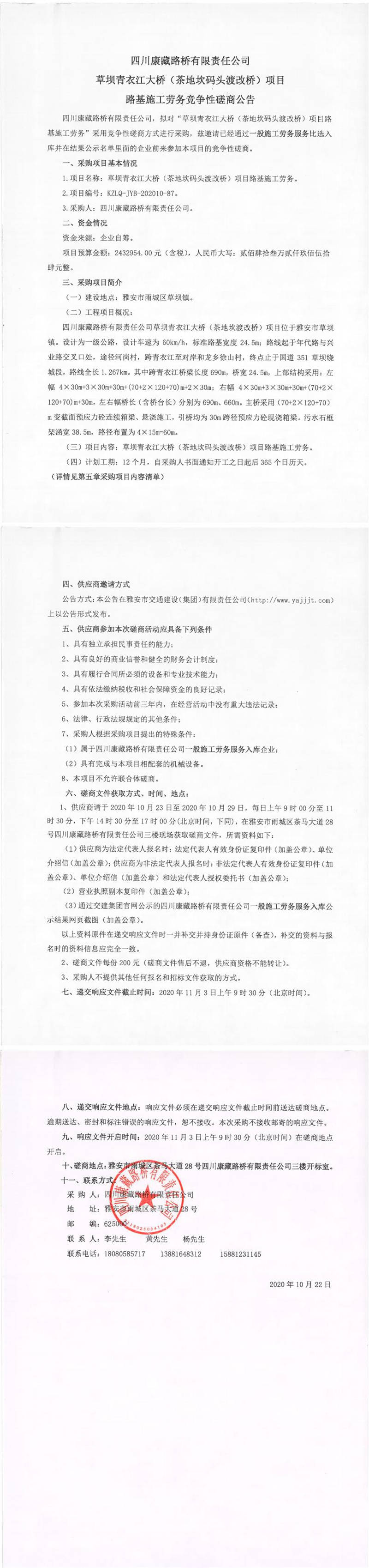 四川康藏路橋有限責任公司草壩青衣江大橋(茶地坎碼頭渡改橋)項目路基施工勞務競爭性磋商公告