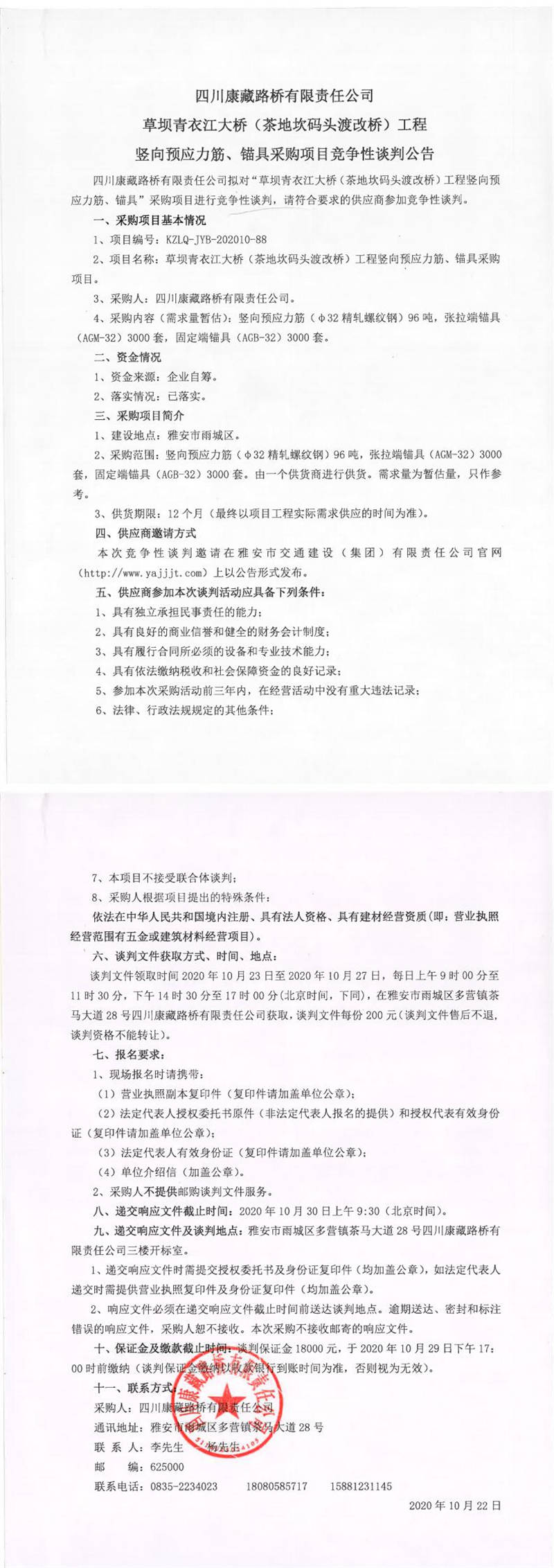 四川康藏路橋有限責任公司草壩青衣江大橋(茶地坎碼頭渡改橋)工程豎向預應力筋、錨具采購項目競爭性談判公告