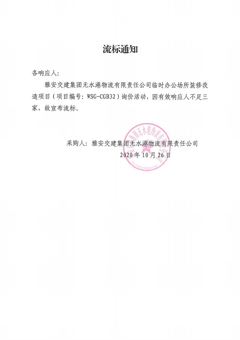 雅安交建集團無水港物流有限責任公司臨時辦公場所裝修改造項目流標通知