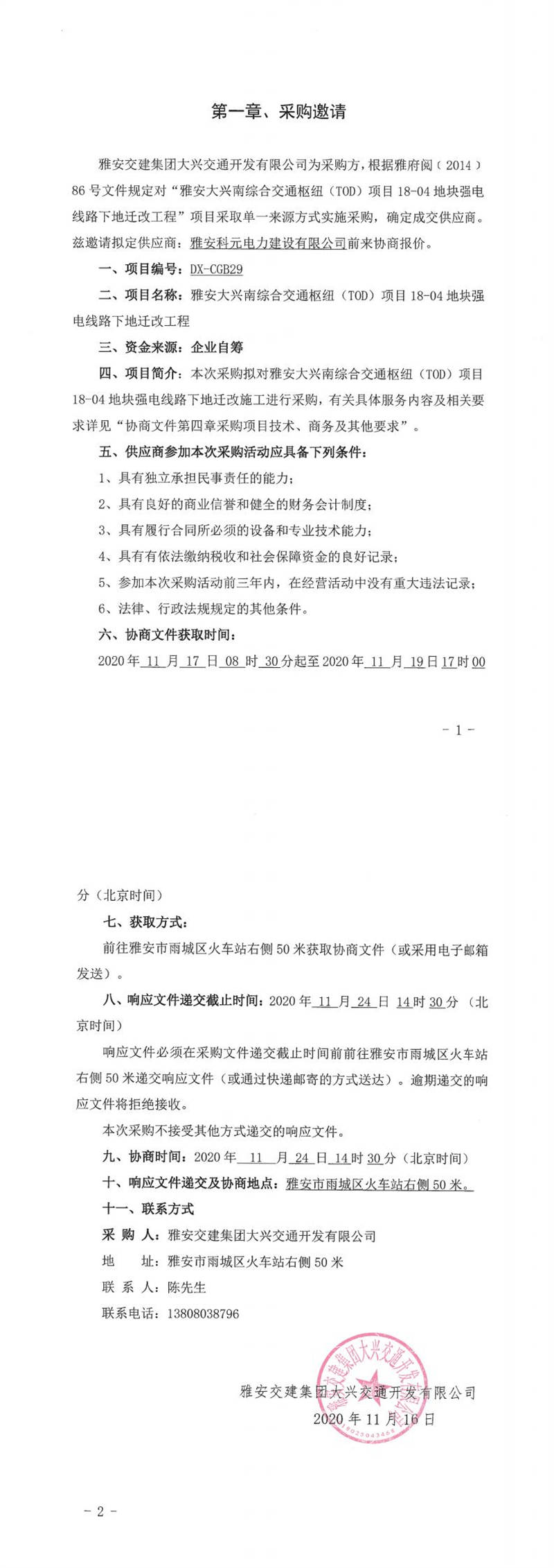 雅安交建集團(tuán)大興交通開發(fā)有限公司雅安大興南綜合交通樞紐(TOD)項(xiàng)目18-04地塊強(qiáng)電線路下地遷改工程單一來源采購邀請