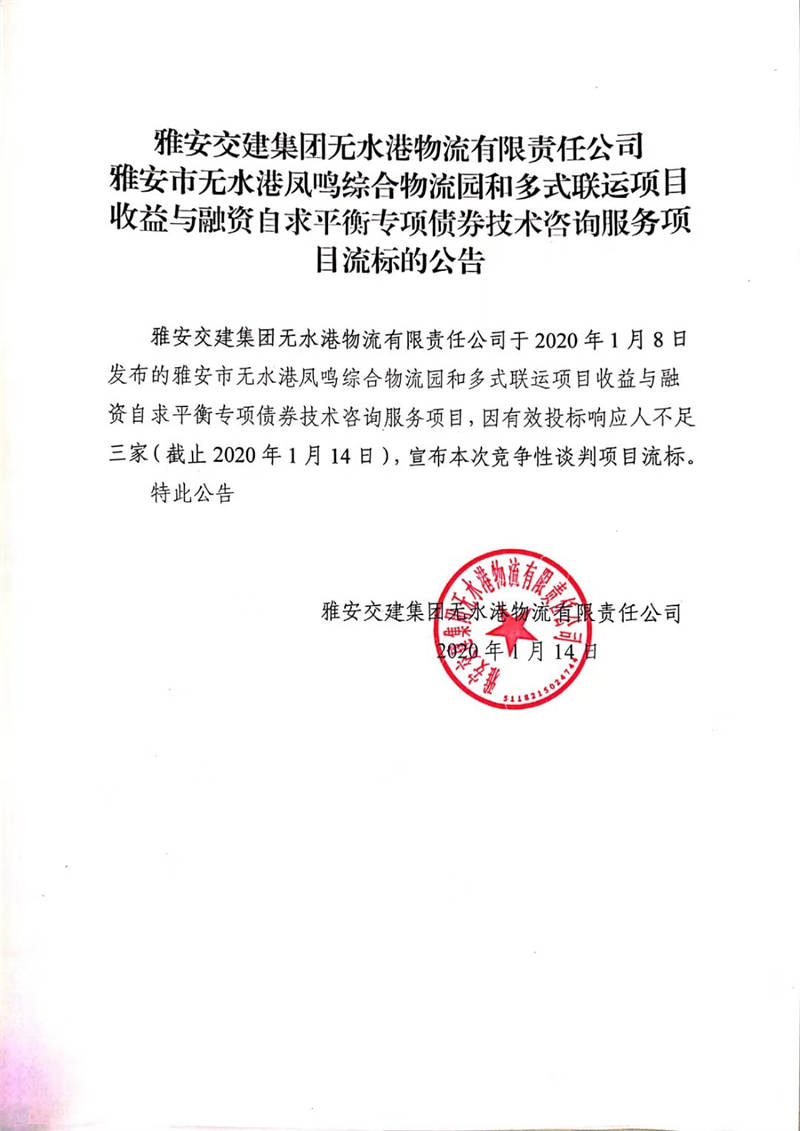 雅安交建集團無水港物流有限責(zé)任公司雅安市無水港鳳鳴綜合物流園和多式聯(lián)運項目收益與融資自求平衡專項債券技術(shù)咨詢服務(wù)項目流標的公告