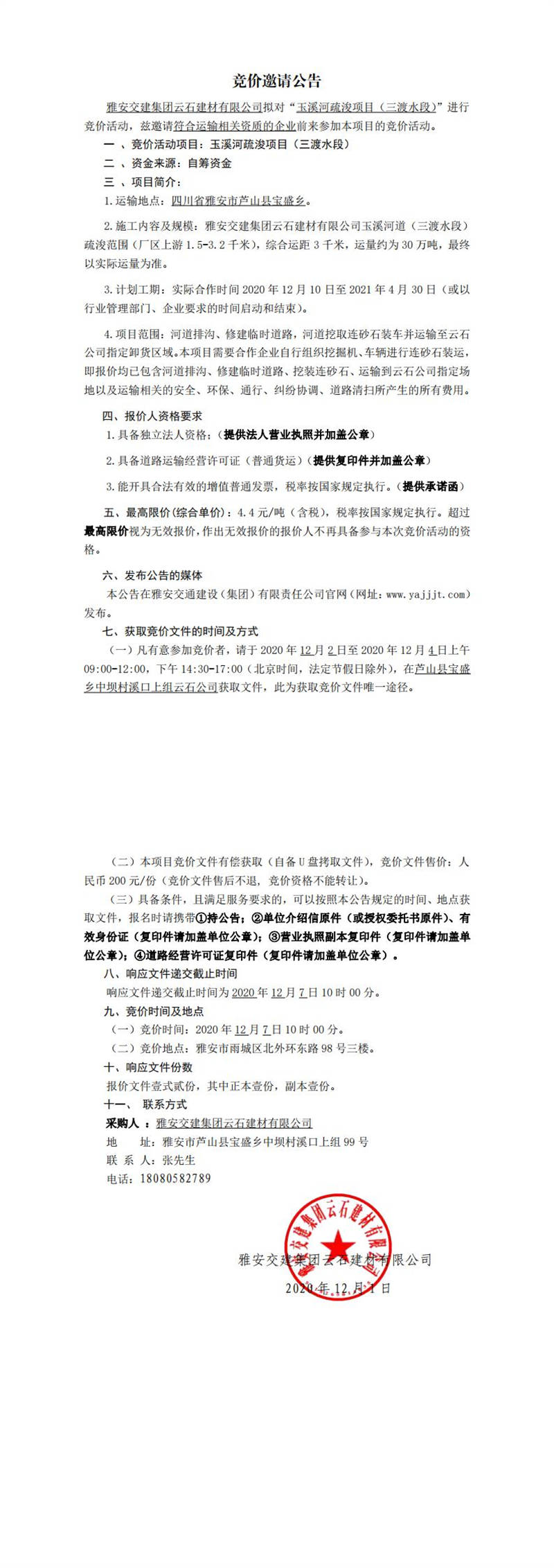 雅安交建集團(tuán)云石建材有限公司玉溪河疏浚項(xiàng)目(三渡水段)競價(jià)公告