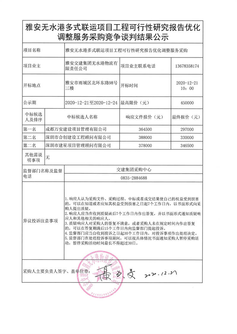 雅安交建集團(tuán)無水港物流有限責(zé)任公司雅安無水港多式聯(lián)運(yùn)項目工程可行性研究報告優(yōu)化調(diào)整服務(wù)采購競爭談判結(jié)果公示