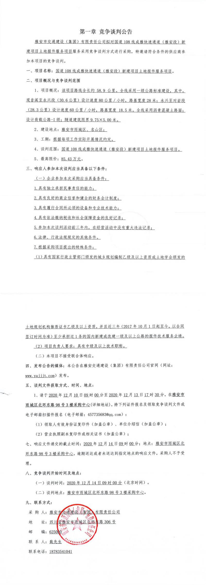 雅安市交通建設(shè)(集團(tuán))有限責(zé)任公司國道108線成雅快速通道(雅安段)新建項(xiàng)目土地報件服務(wù)項(xiàng)目競爭談判公告