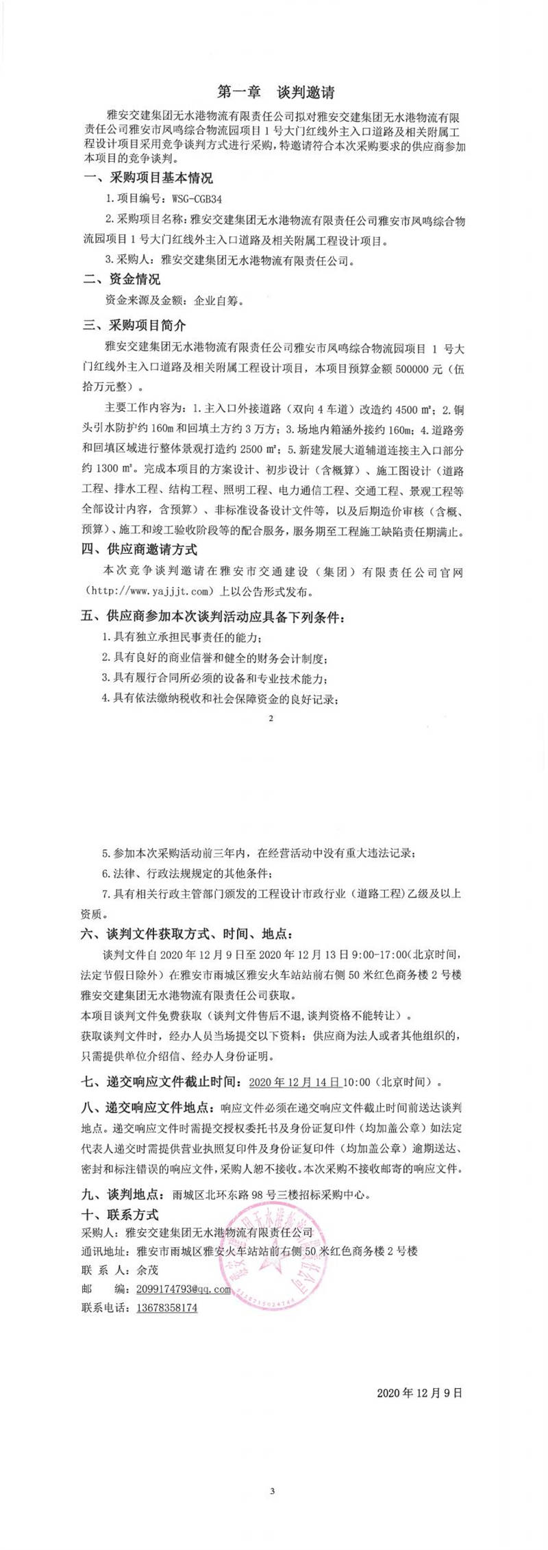 雅安交建集團無水港物流有限責任公司雅安市鳳鳴綜合物流園項目1號大門紅線外主入口道路及相關(guān)附屬工程設(shè)計項目競爭談判公告