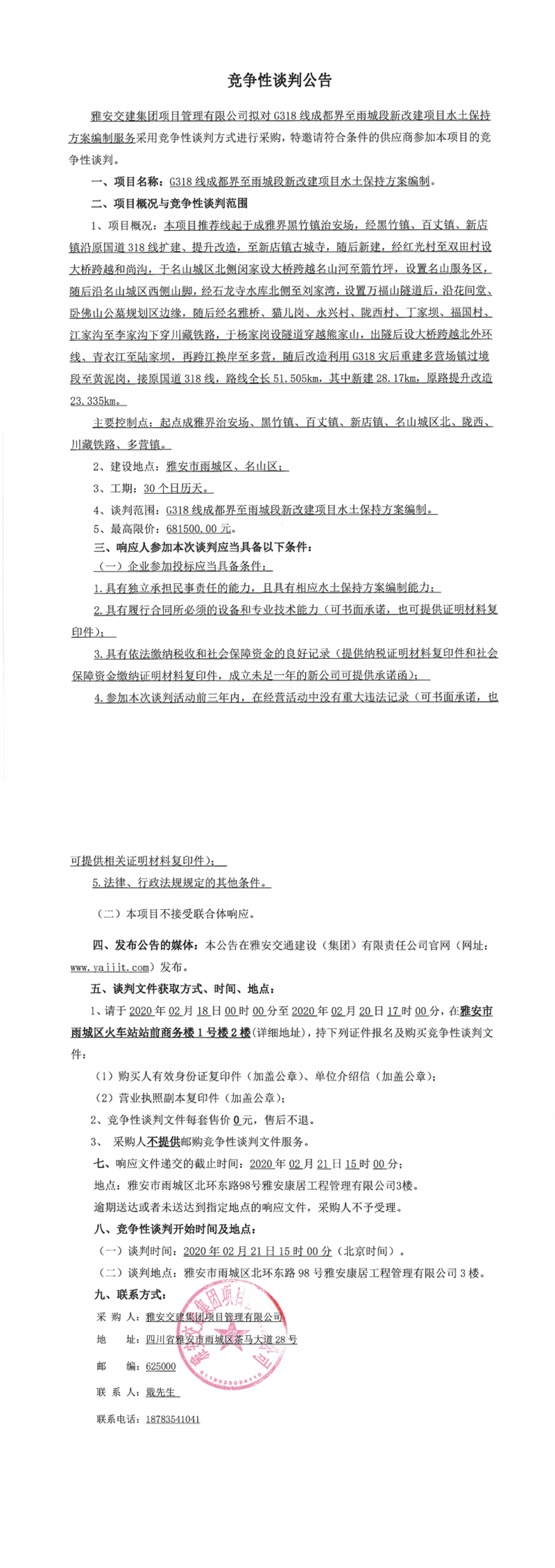 雅安交建集團(tuán)項目管理有限公司G318線成都界至雨城段新改建項目水土保持方案編制競爭性談判公告