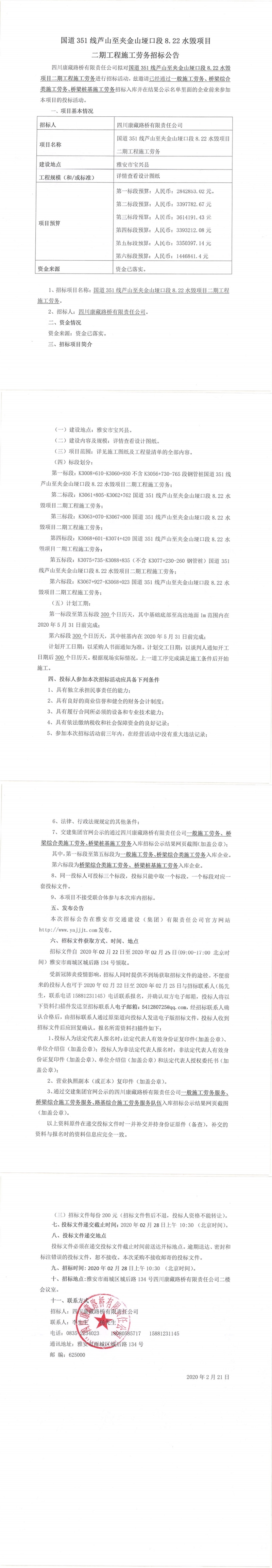 四川康藏路橋有限責(zé)任公司國道351線蘆山至夾金山埡口段8.22水毀項目二期工程施工勞務(wù)招標(biāo)公告