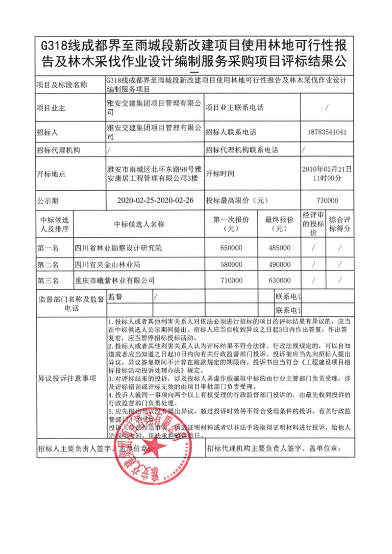雅安交建集團項目管理有限公司G318線成都界至雨城段新改建項目使用林地可行性報告及林木采伐作業(yè)設(shè)計編制服務(wù)采購項目評標結(jié)果公示