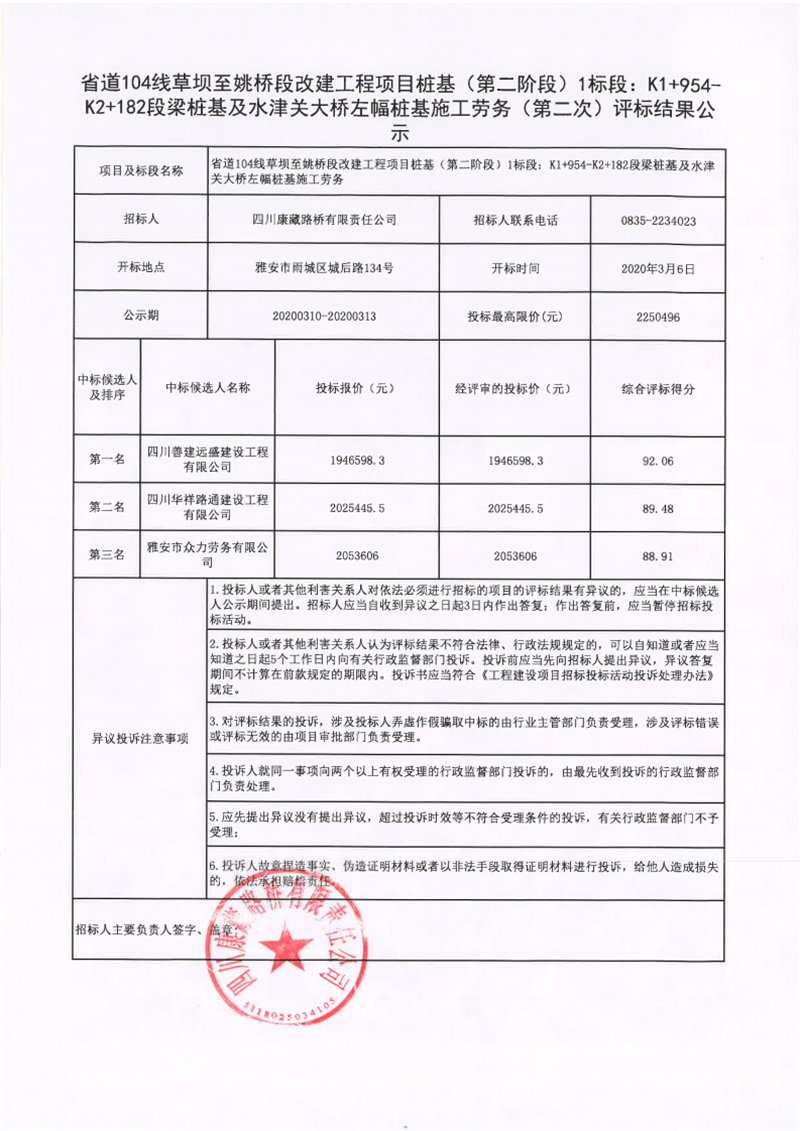 四川康藏路橋有限責任公司省道104線草壩至姚橋段改建工程項目樁基(第二階段)1標段:K1+954-K2+182段梁樁基及水津關(guān)大橋左幅樁基施工勞務(第二次)評標結(jié)果公示