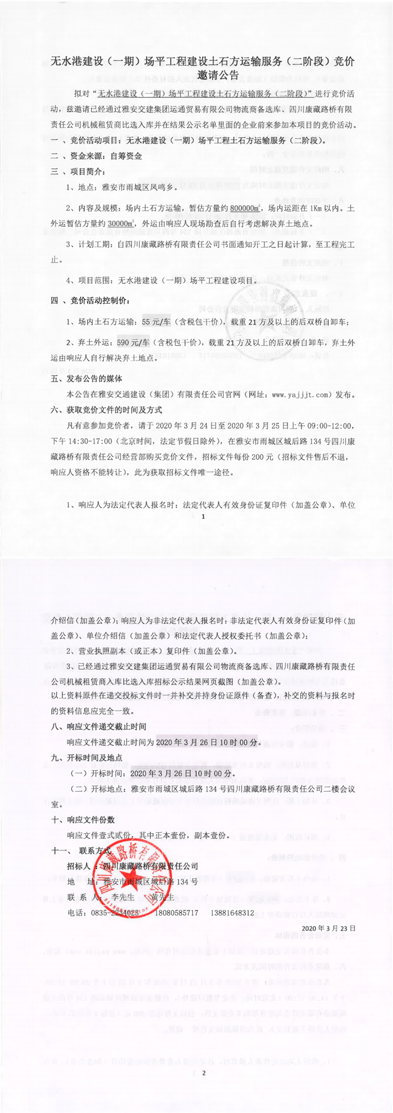 四川康藏路橋有限責(zé)任公司無(wú)水港建設(shè)(一期)場(chǎng)平工程建設(shè)土石方運(yùn)輸服務(wù)(二階段)競(jìng)價(jià)邀請(qǐng)公告