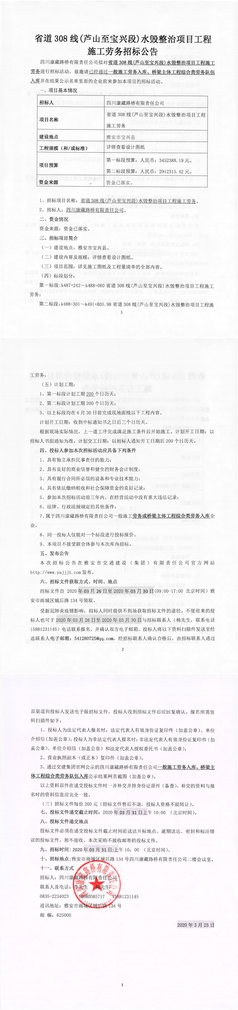 四川康藏路橋有限責(zé)任公司省道308線(蘆山至寶興段)水毀整治項目工程施工勞務(wù)招標公告