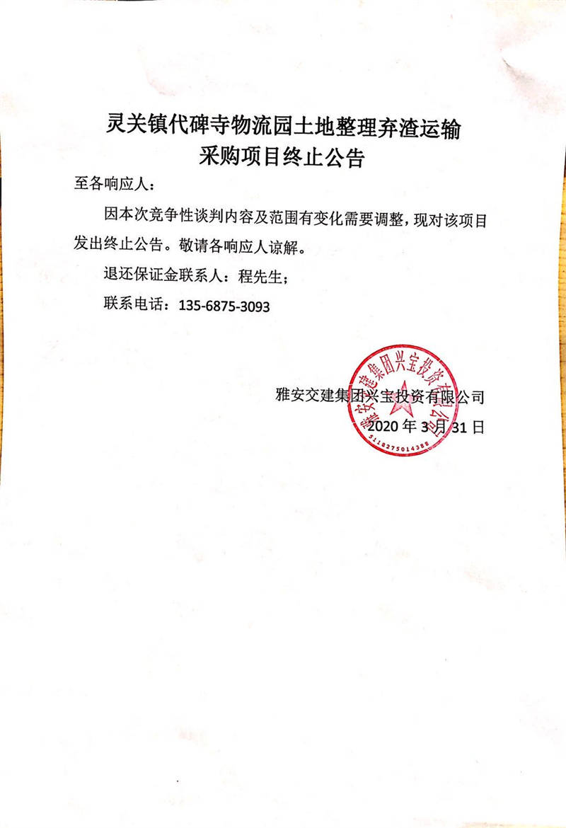 雅安交建集團興寶投資有限公司靈關(guān)鎮(zhèn)代碑寺物流園土地整理棄渣運輸采購項目終止公告