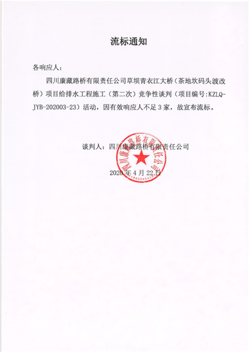 四川康藏路橋有限責(zé)任公司草壩青衣江大橋(茶地坎碼頭渡改橋)項目給排水工程施工(第二次)競爭性談判流標(biāo)通知