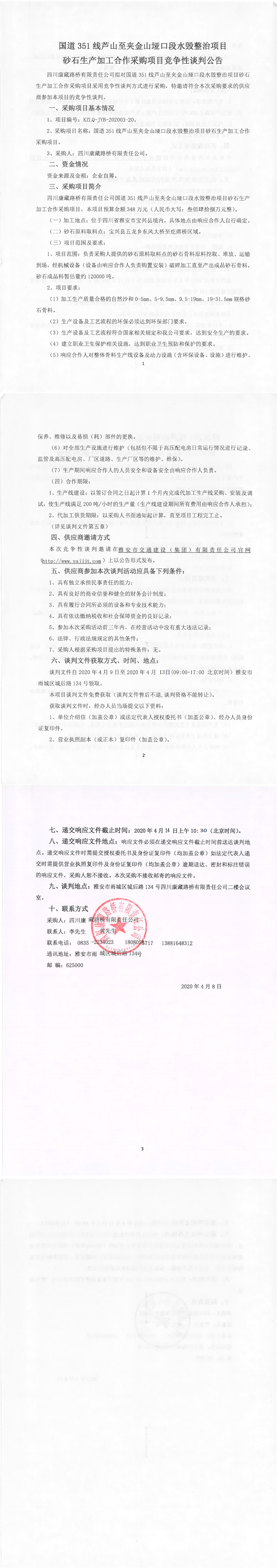 四川康藏路橋有限責(zé)任公司國(guó)道351線蘆山至夾金山埡口段水毀整治項(xiàng)目砂石生產(chǎn)加工合作采購(gòu)項(xiàng)目競(jìng)爭(zhēng)性談判公告