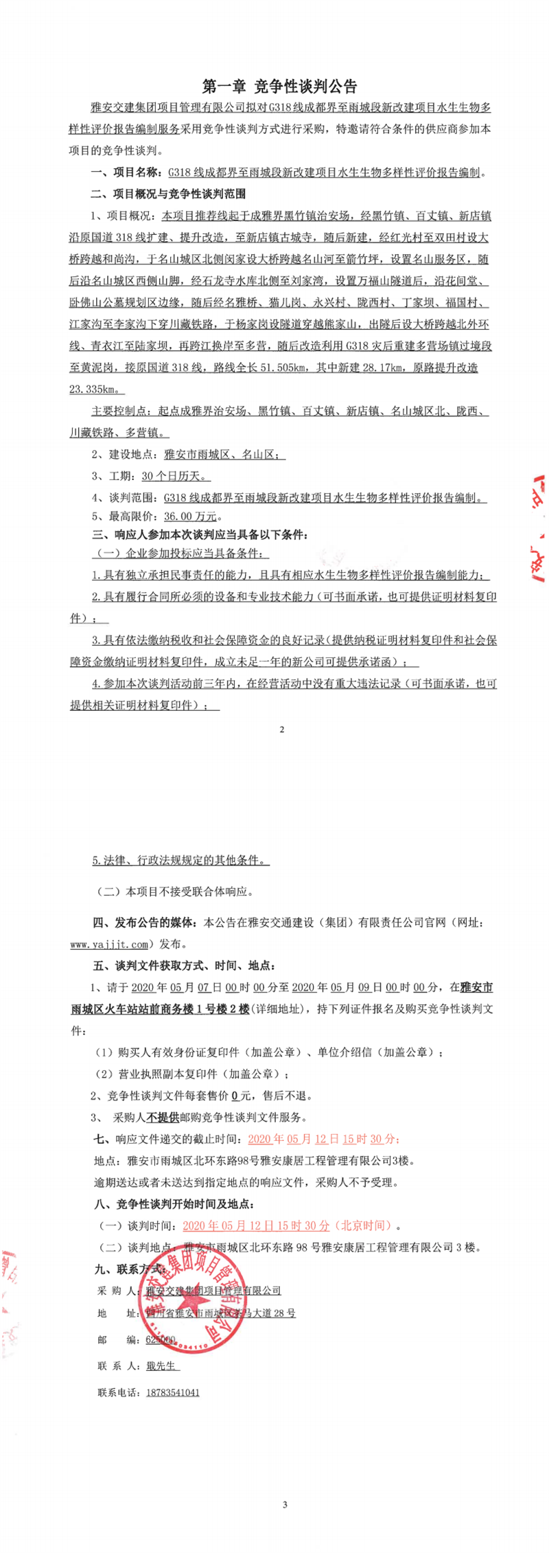 雅安交建集團(tuán)項(xiàng)目管理有限公司G318線成都界至雨城段新改建項(xiàng)目水生生物多樣性評價(jià)報(bào)告編制競爭性談判(第二次)公告