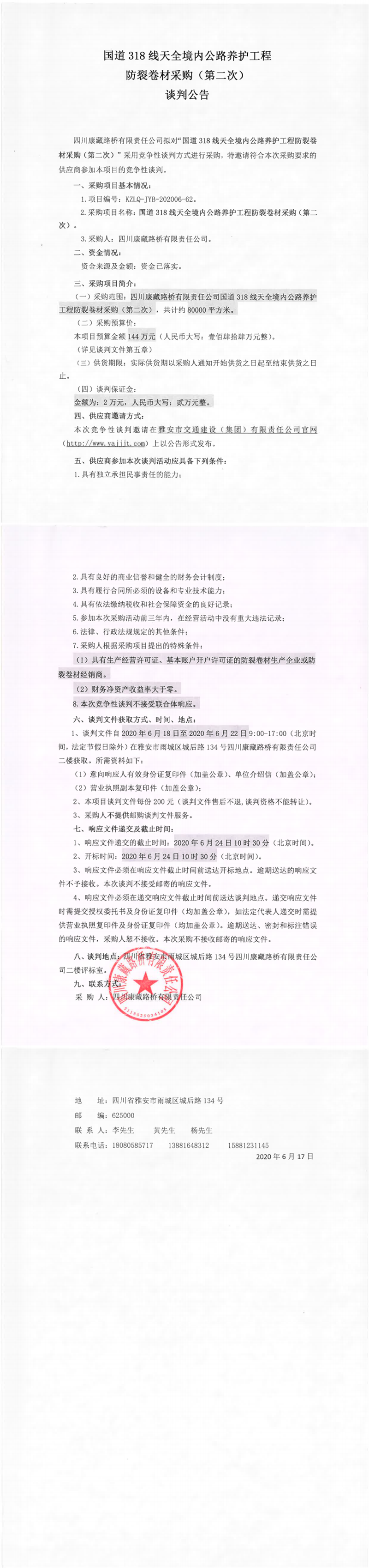四川康藏路橋有限責(zé)任公司國(guó)道318線天全境內(nèi)公路養(yǎng)護(hù)工程防裂卷材采購(第二次)談判公告