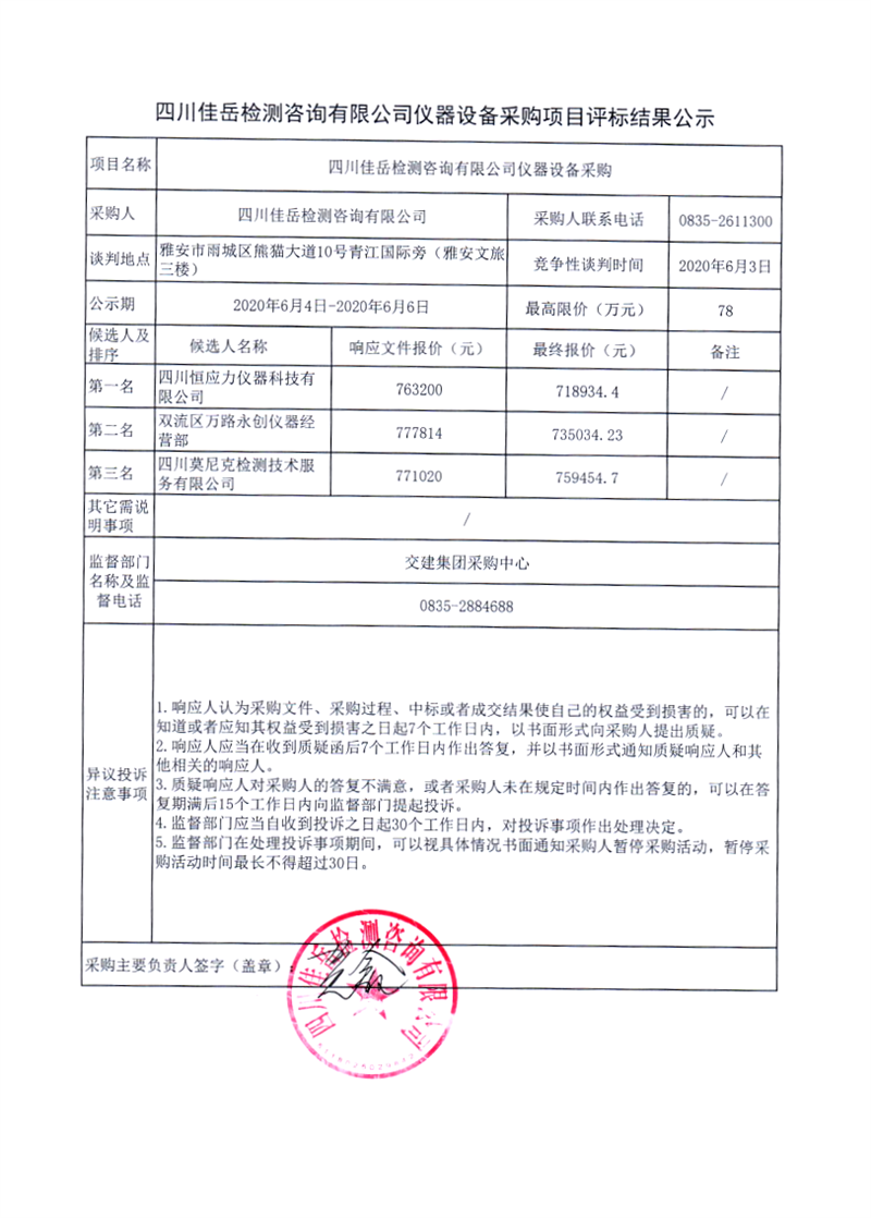 四川佳岳檢測咨詢有限公司儀器設備采購項目評標結(jié)果公示