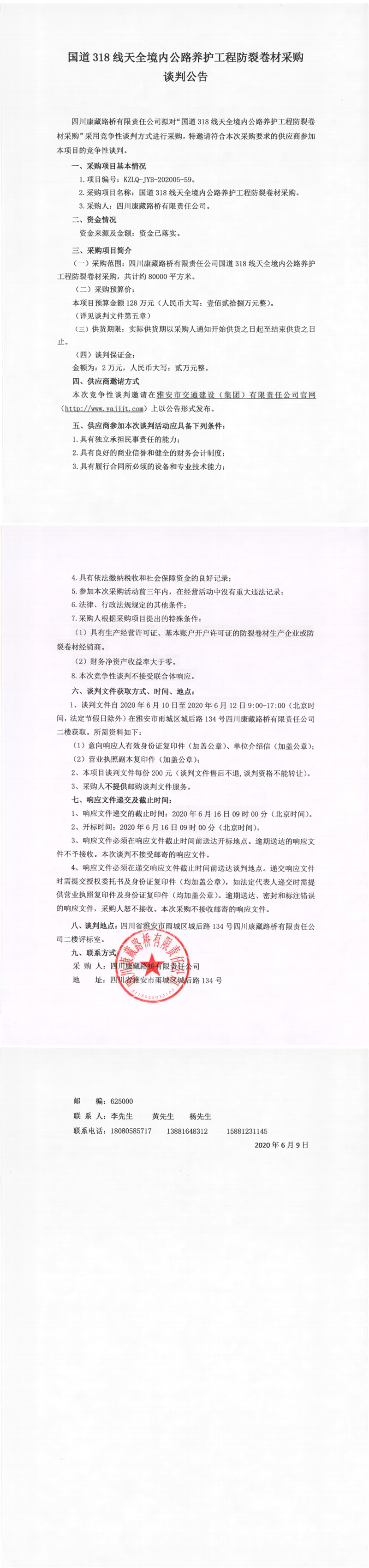 四川康藏路橋有限責(zé)任公司國(guó)道318線天全境內(nèi)公路養(yǎng)護(hù)工程防裂卷材采購(gòu)競(jìng)爭(zhēng)性談判公告