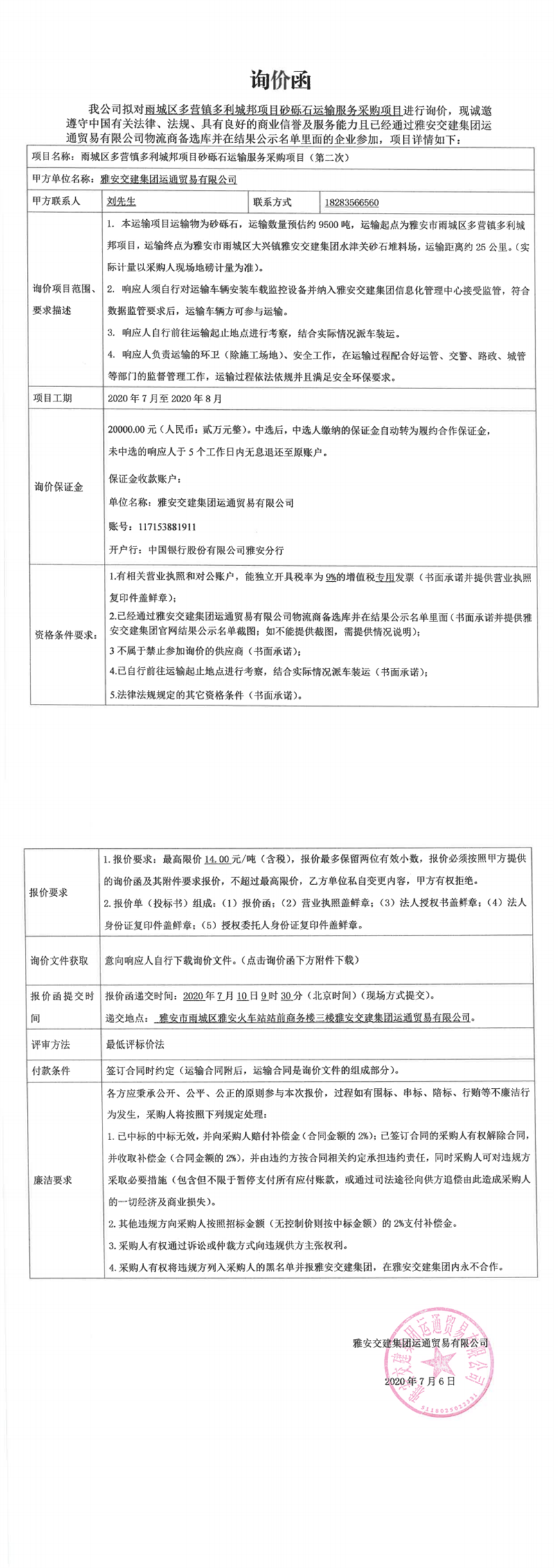 雅安交建集團運通貿(mào)易有限公司雨城區(qū)多營鎮(zhèn)多利城邦項目砂礫石運輸服務(wù)采購項目(第二次)詢價函