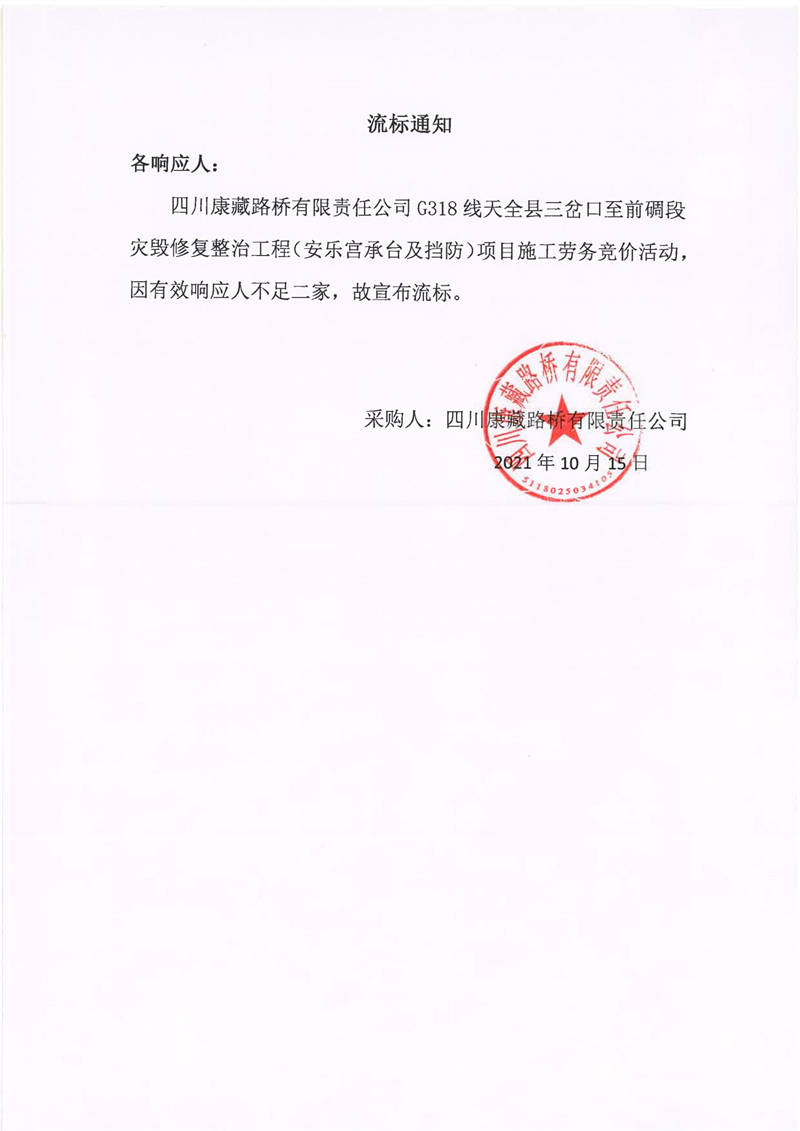 四川康藏路橋有限責任公司G318線天全縣三岔口至前碉段災毀修復整治工程(安樂宮承臺及擋防)項目施工勞務流標通知