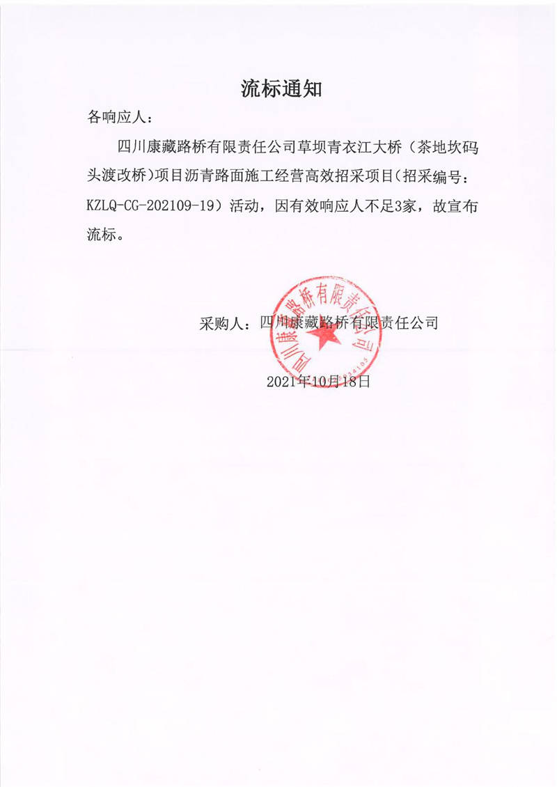 四川康藏路橋有限責(zé)任公司草壩青衣江大橋(茶地坎碼頭渡改橋)項目瀝青路面施工經(jīng)營高效招采項目流標通知