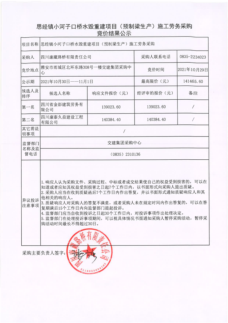 四川康藏路橋有限責任公司思經(jīng)鎮(zhèn)小河子口橋水毀重建項目(預制梁生產(chǎn))施工勞務采購競價結(jié)果公示