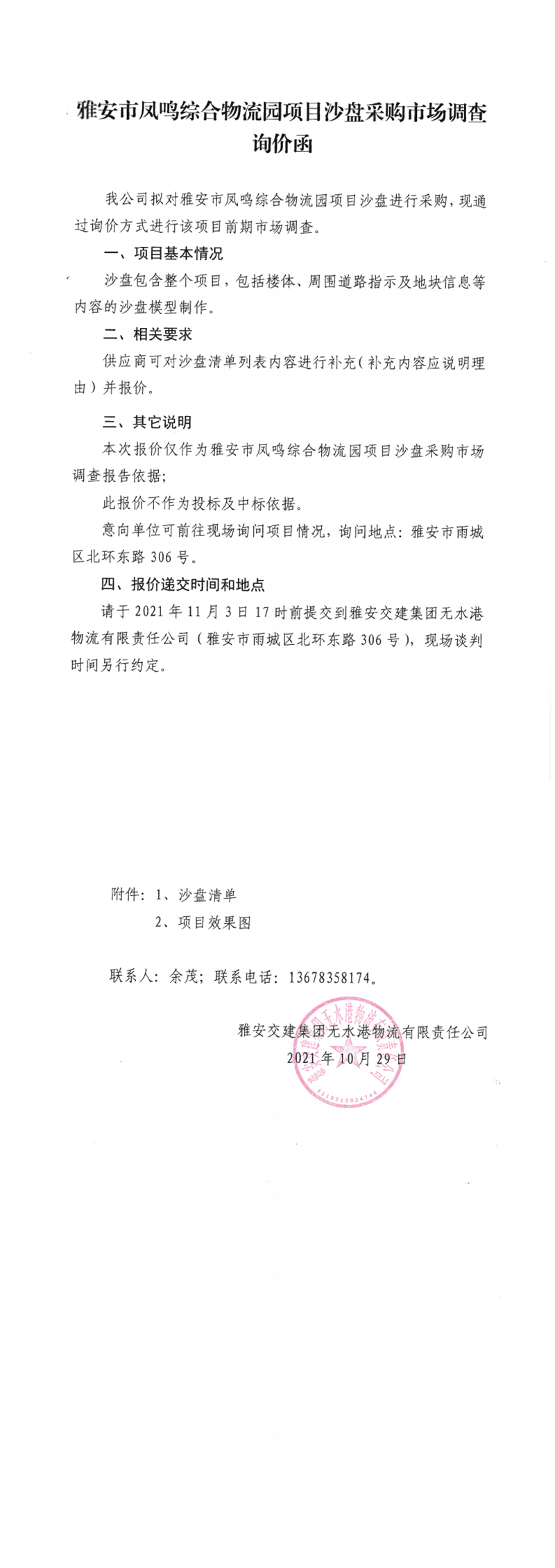 雅安交建集團無水港物流有限責(zé)任公司雅安市鳳鳴綜合物流園項目沙盤采購市場調(diào)查詢價函