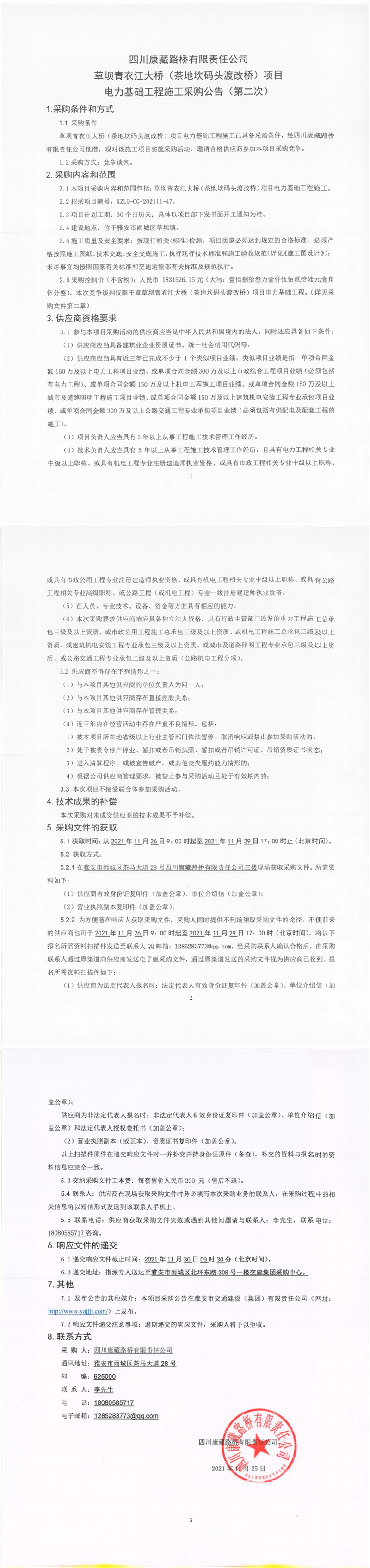 四川康藏路橋有限責(zé)任公司草壩青衣江大橋(茶地坎碼頭渡改橋)項目電力基礎(chǔ)工程施工采購公告(第二次)