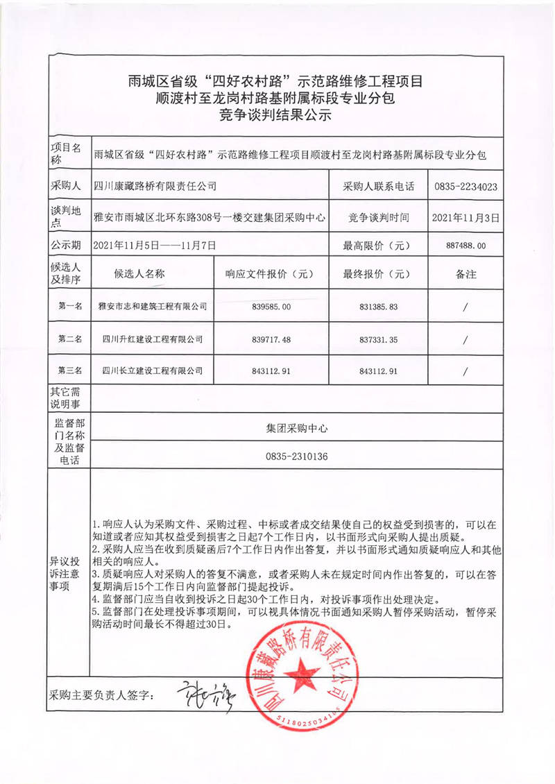 四川康藏路橋有限責(zé)任公司雨城區(qū)省級(jí)“四好農(nóng)村路”示范路維修工程項(xiàng)目順渡村至龍崗村路基附屬標(biāo)段專(zhuān)業(yè)分包競(jìng)爭(zhēng)談判結(jié)果公示