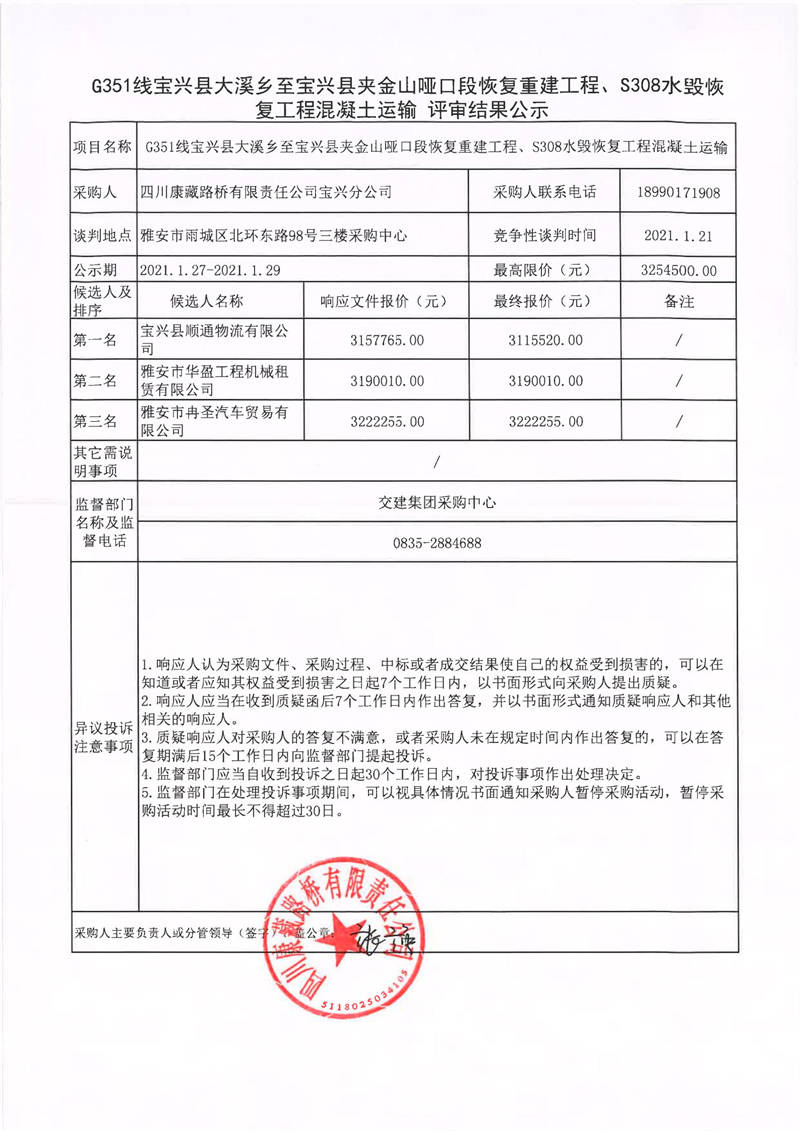 四川康藏路橋有限責(zé)任公司寶興分公司G351線寶興縣大溪鄉(xiāng)至寶興縣夾金山啞口段恢復(fù)重建工程、S308水毀恢復(fù)工程混凝土運輸評審結(jié)果公示