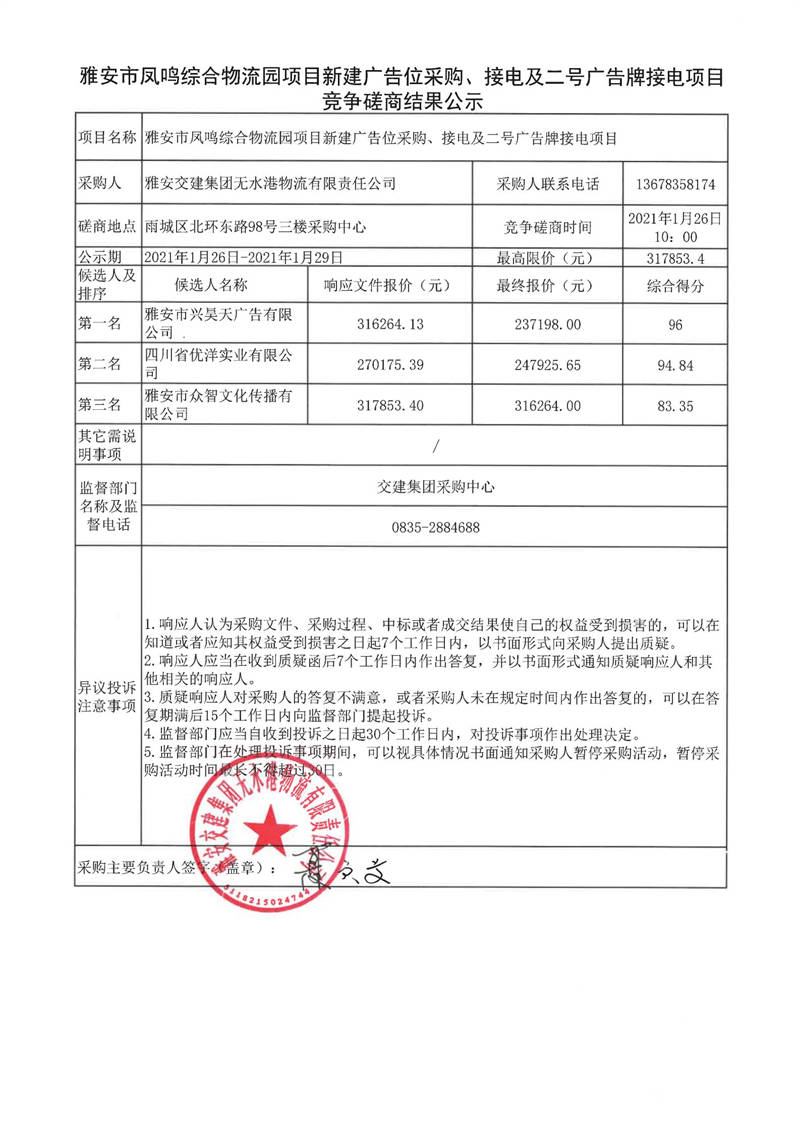 雅安交建集團無水港物流有限責(zé)任公司雅安市鳳鳴綜合物流園項目新建廣告位采購、接電及二號廣告牌接電項目競爭磋商結(jié)果公示