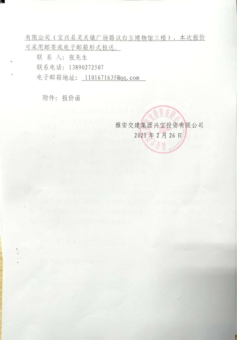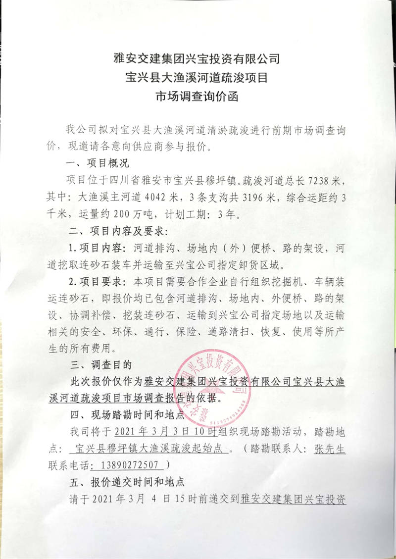 雅安交建集團(tuán)興寶投資有限公司寶興縣大漁溪河道疏浚項(xiàng)目市場調(diào)查詢價(jià)公告