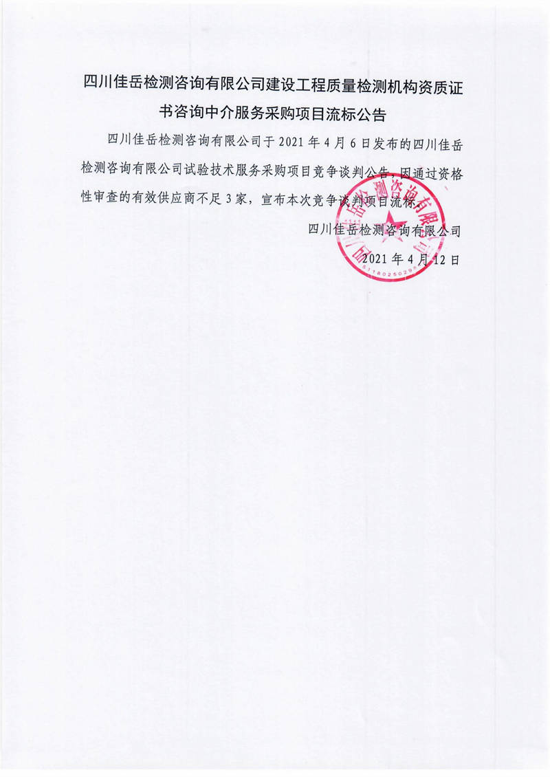 四川佳岳檢測(cè)咨詢(xún)有限公司建設(shè)工程質(zhì)量檢測(cè)機(jī)構(gòu)資質(zhì)證書(shū)咨詢(xún)中介服務(wù)采購(gòu)項(xiàng)目流標(biāo)公告