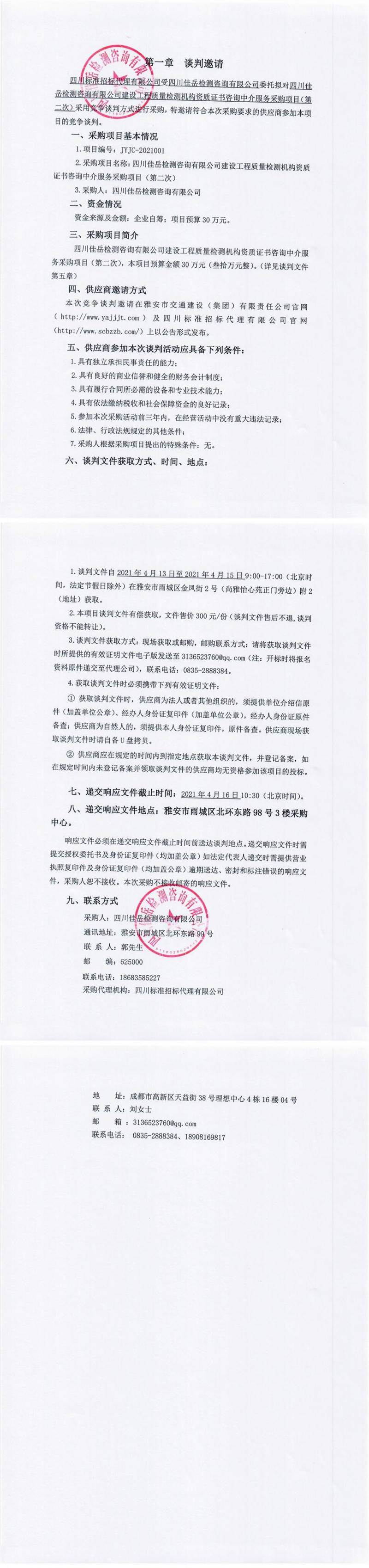 四川佳岳檢測(cè)咨詢有限公司建設(shè)工程質(zhì)量檢測(cè)機(jī)構(gòu)資質(zhì)證書咨詢中介服務(wù)采購項(xiàng)目(第二次)競(jìng)爭(zhēng)談判公告